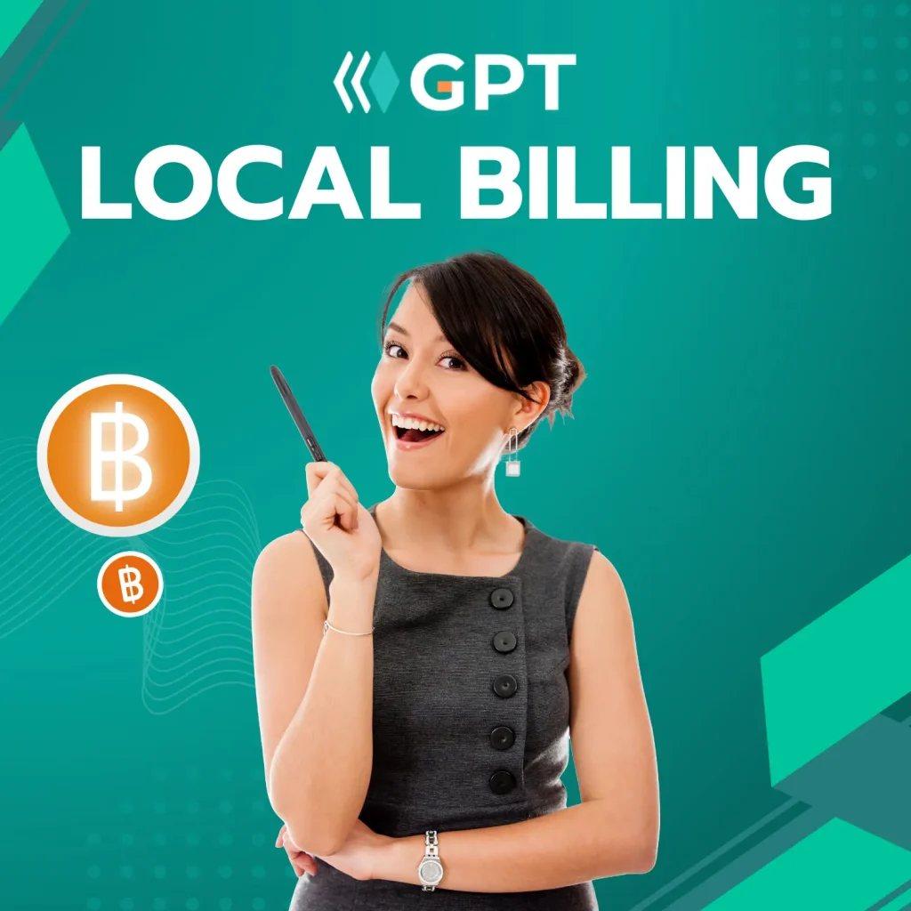 เราเป็นบริการตัวแทนชำระเงิน จากผู้ให้บริการ AI ต่างๆ ซึ่งช่วยลดความชับซ้อนในกระบวนการจัดซื้อสามารถชำระค่าบริการด้วยสกุลเงินบาทไทย พร้อมใบกำกับภาษีในนามบริษัทที่รองรับการทำบัญชีตามกฎหมายไทยอย่างครบถัวน และนำส่งภาษีอย่างถูกต้อง โดย GPT.in.th จะมีบริการให้คำแนะนำ และอบรมเบื้องต้นแก่ลูกค้าที่ใช้ Local Billing กับเรา